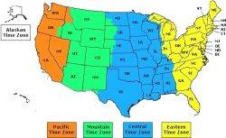 ⏰ U sklopu većinskog dela Amerike (susedne države) su četiri vremenske zone + aljaska zona – tvoja je jedna od njih! To su: istočna (žuta), centralna (plava), planinska (zelena), pacifik (narandžasta) i aljaska (bela) vremenska zona. Pogledaj na slici: